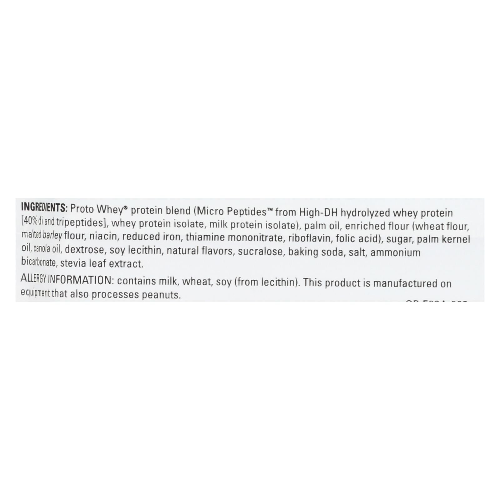ingredients : proto whey® protein blend;micro peptides™ from high-dh hydrolyzed whey protein [40% di and tripeptides];whey protein isolate;milk protein isolate;palm oil;enriched flour;wheat flour;malted barley flour;niacin;reduced iron;thiamine mononitrate;riboflavin;folic acid;sugar;palm kernel oil;canola oil;dextrose;soy lecithin;natural flavors;sucralose;baking soda;salt;ammonium bicarbonate;stevia leaf extract