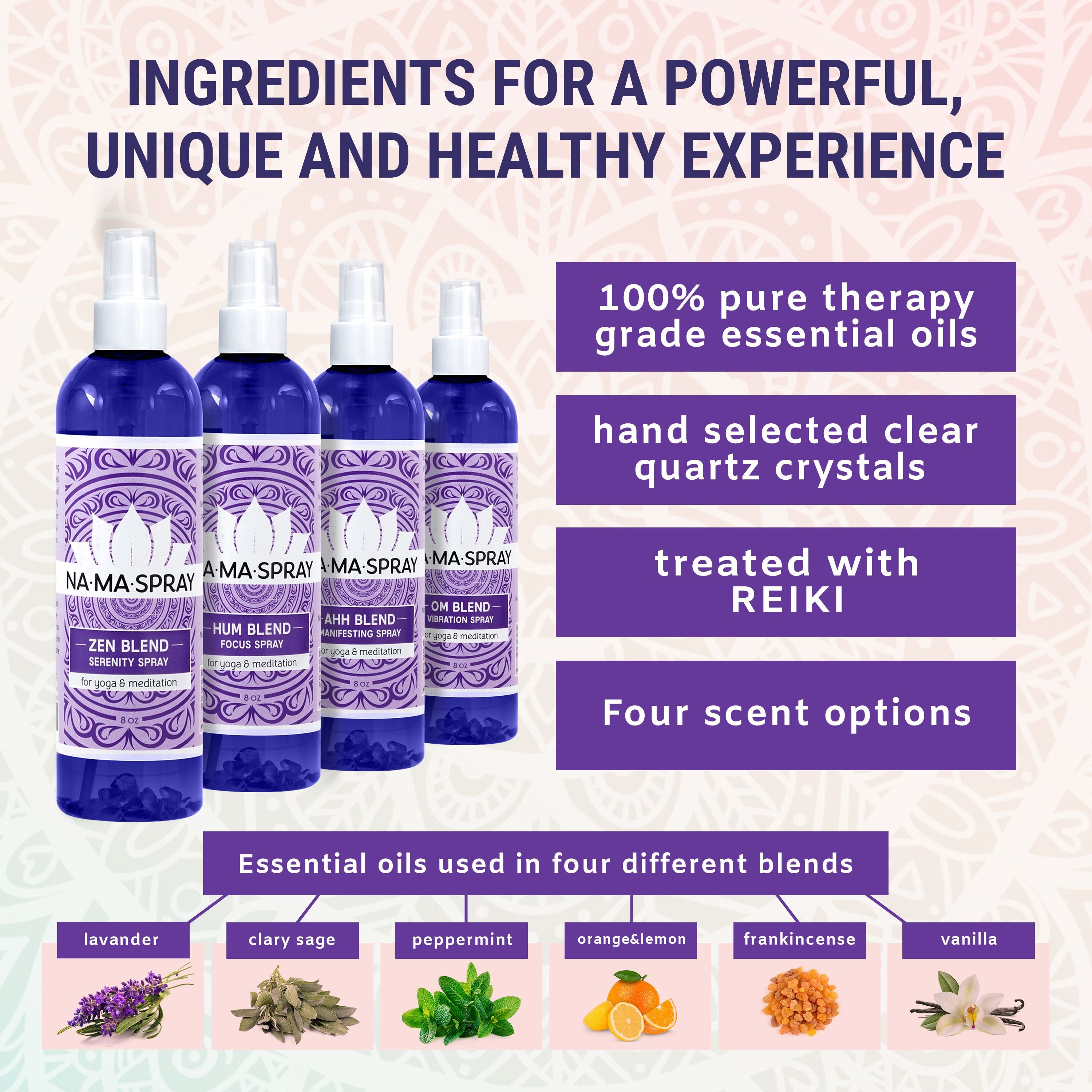1.Four UNIQUE 8 Ounce Blends: Distilled water (NOT chlorinated city tap water). Organic essential oils. Handpicked Clear Quartz Crystals in EVERY bottle. PLUS EVERY bottle is treated with Reiki for maximum holistic benefits. NAMASPRAY is created to deliver unique attributes and promote openness and cl
